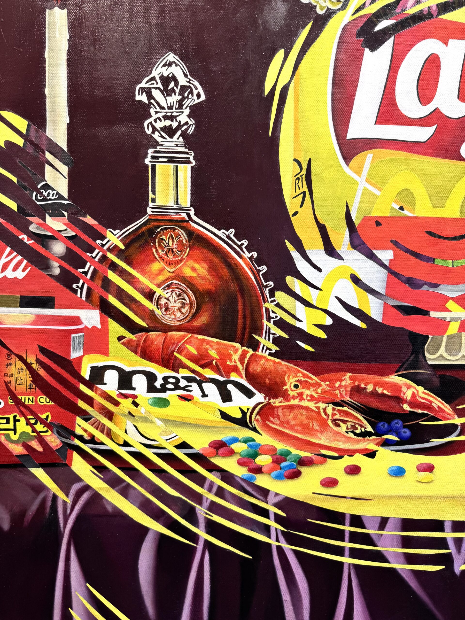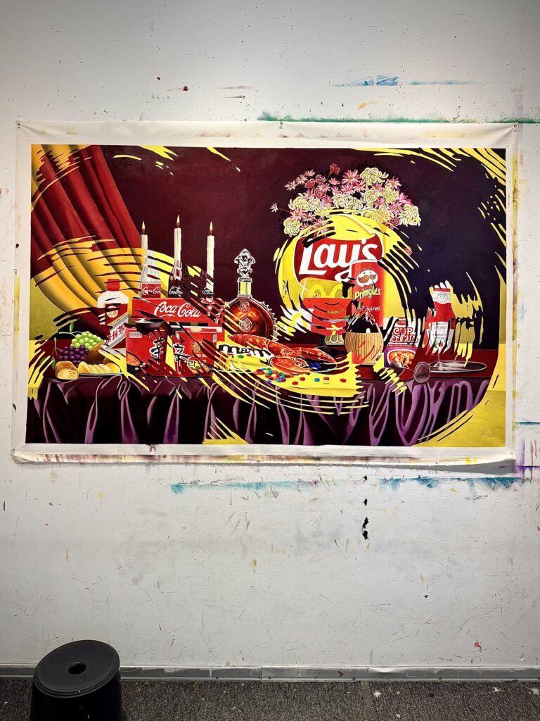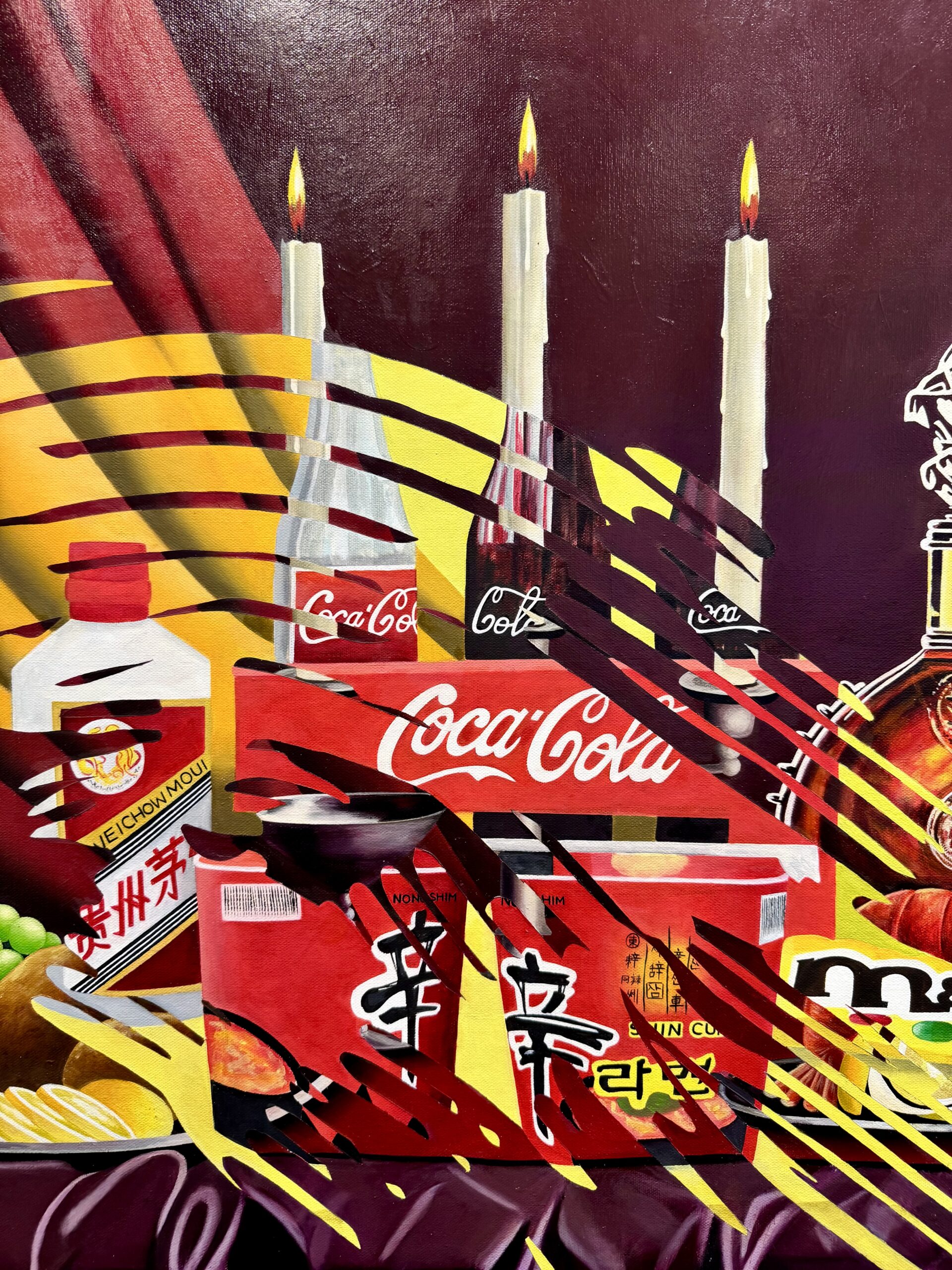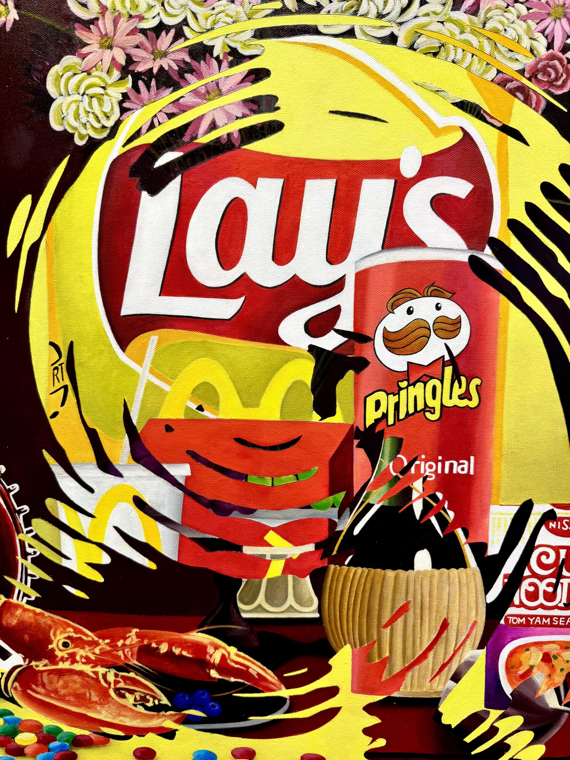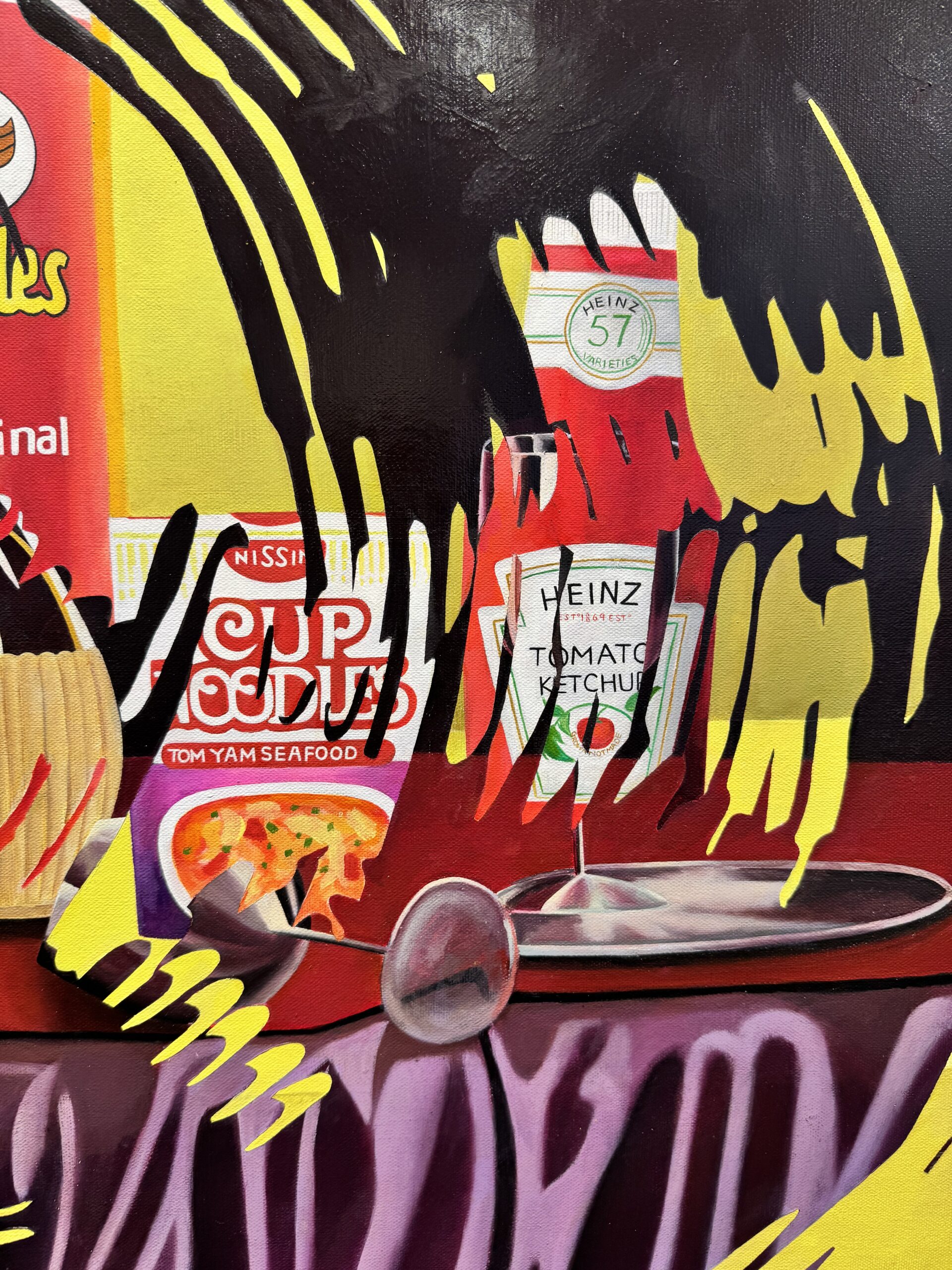This painting reinterprets the Dutch Golden Age still life tradition, where lavish displays of fruits, bread, wine, and flowers once symbolized wealth, mortality, and the passage of time. Here, those emblems of refinement and reflection are replaced by the icons of our present day: Coca-Cola, Pringles, instant noodles, ketchup, and candy—factory-made, instantly recognizable, and mass-produced.