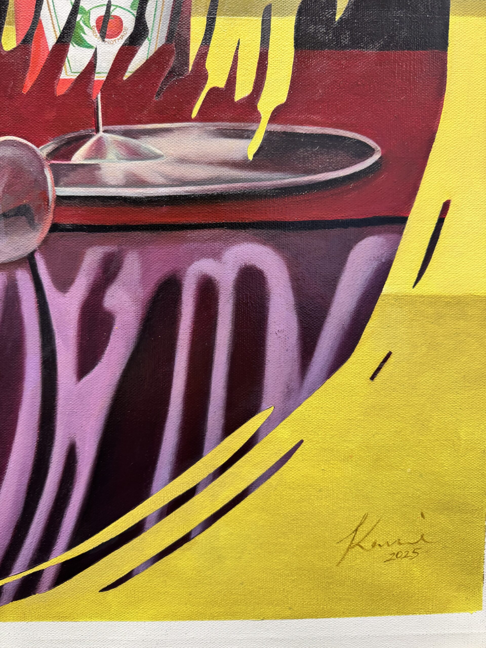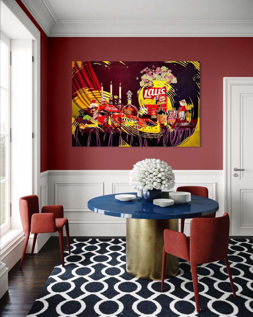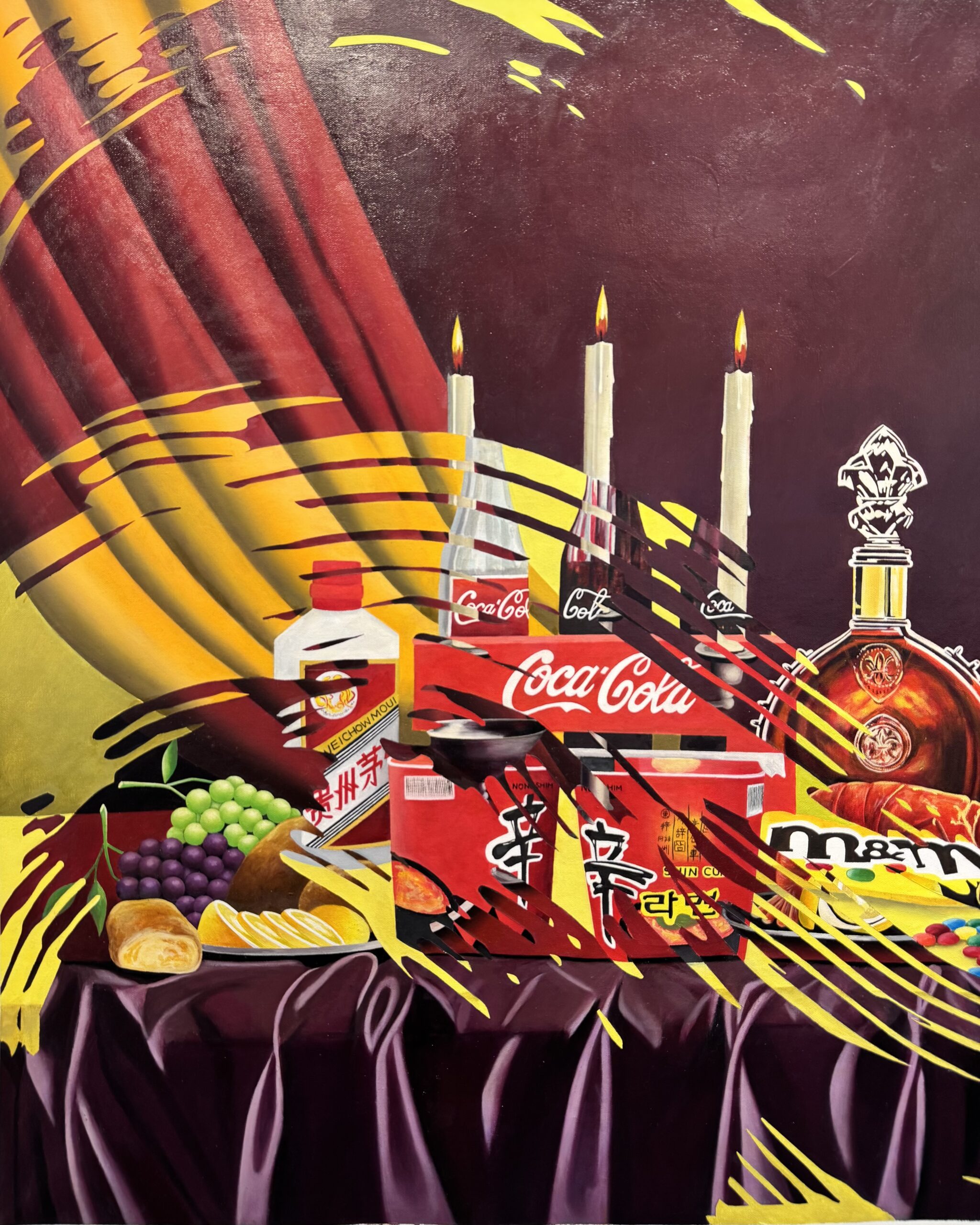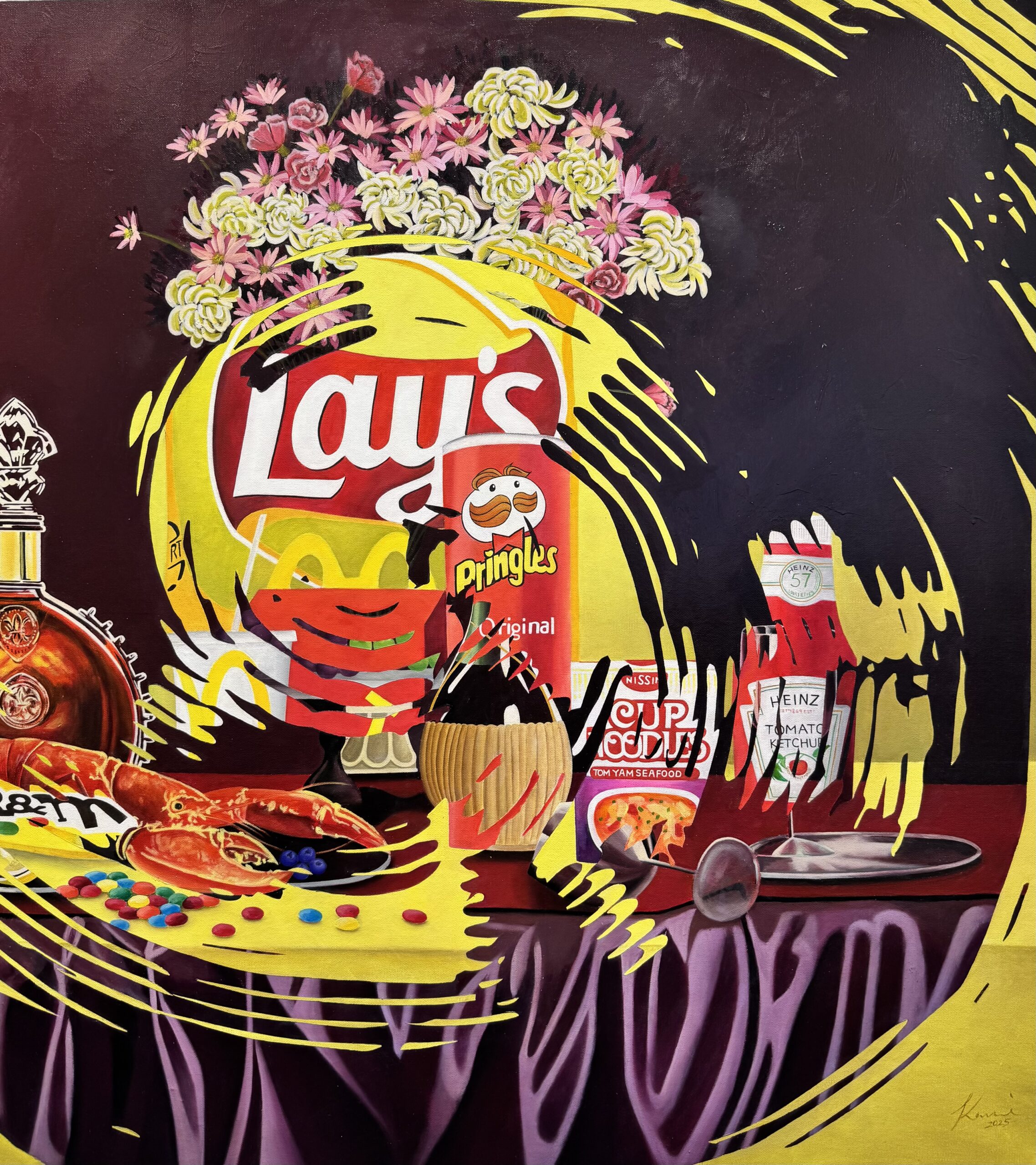 This painting reinterprets the Dutch Golden Age still life tradition, where lavish displays of fruits, bread, wine, and flowers once symbolized wealth, mortality, and the passage of time. Here, those emblems of refinement and reflection are replaced by the icons of our present day: Coca-Cola, Pringles, instant noodles, ketchup, and candy—factory-made, instantly recognizable, and mass-produced.